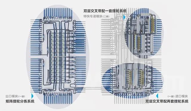配置一套雙層小件分揀機系統用于特快專遞小件和文件處理,配置一套矩陣擺輪分揀系統用于特快專遞大件、總包郵件的處理和傳輸。